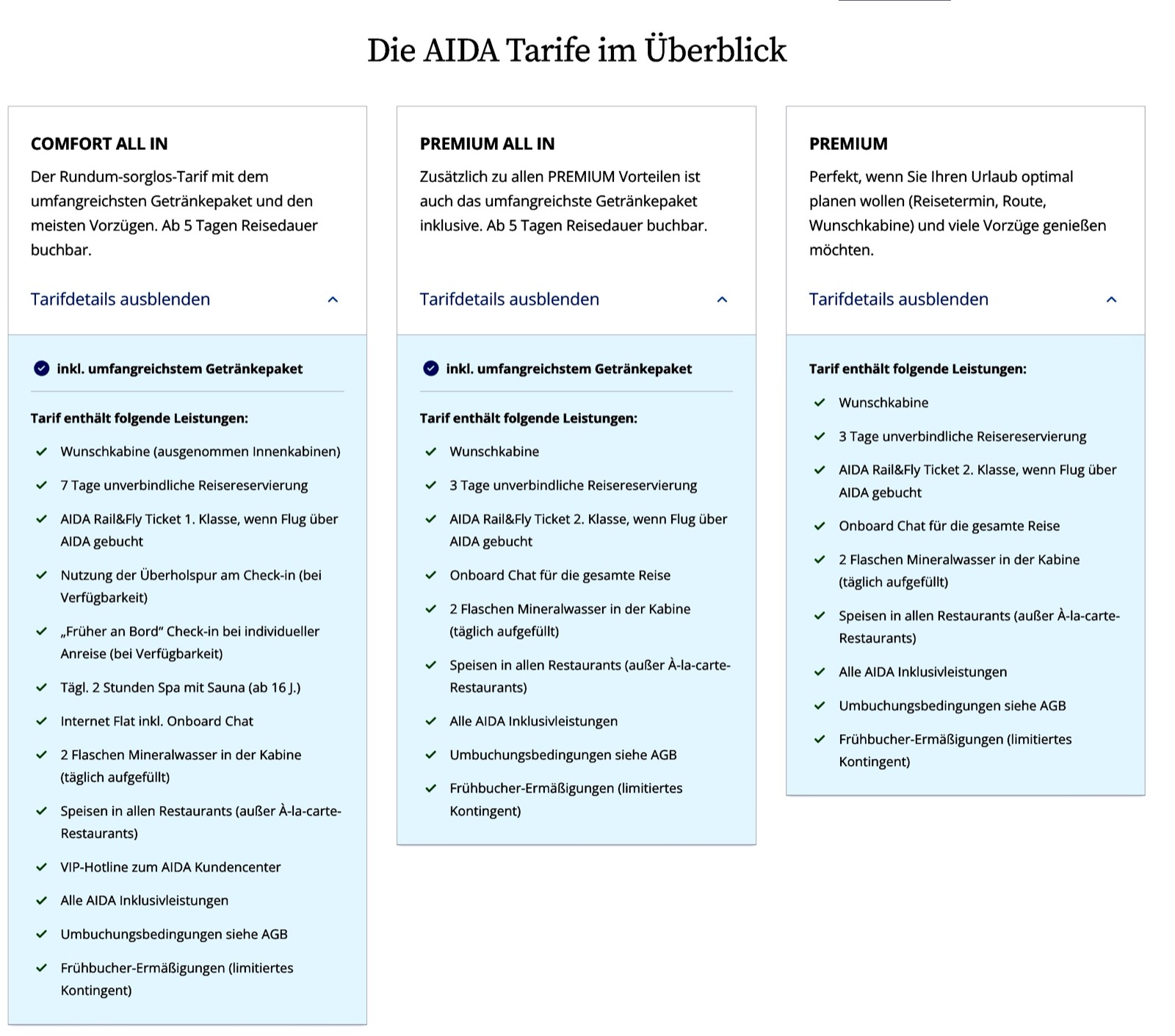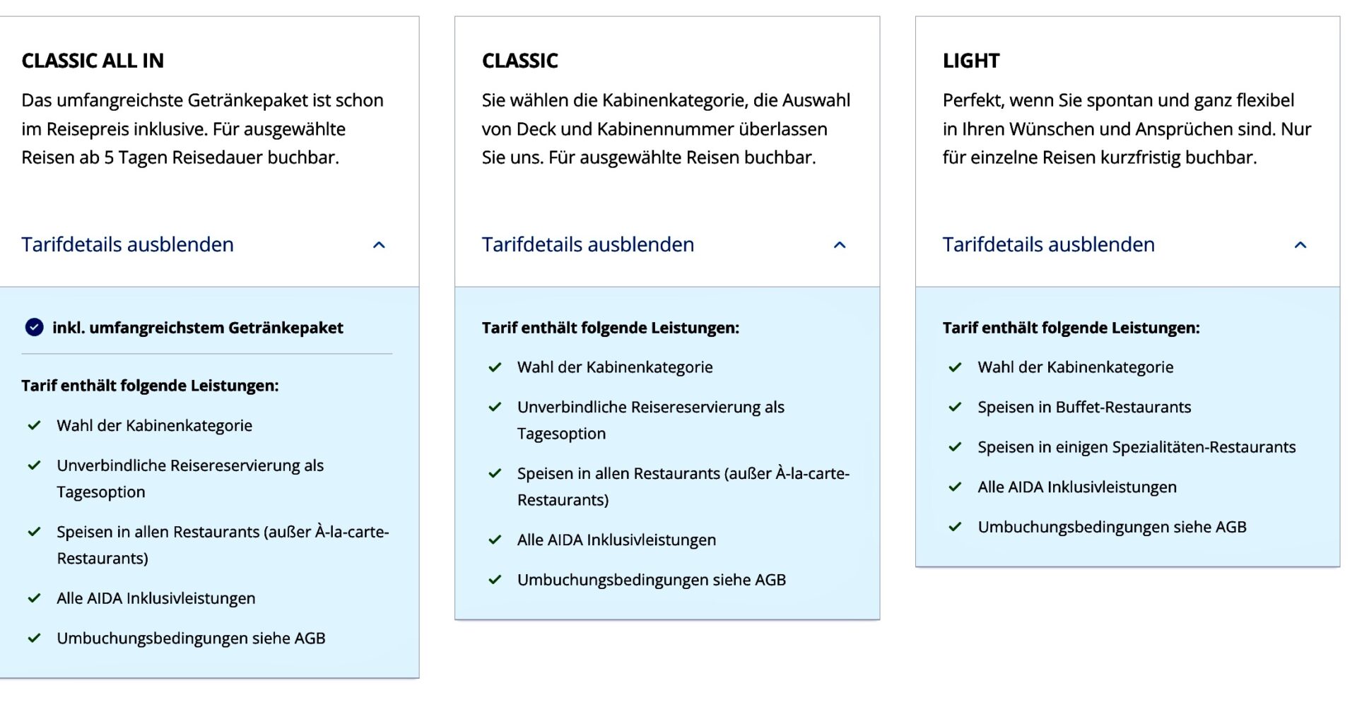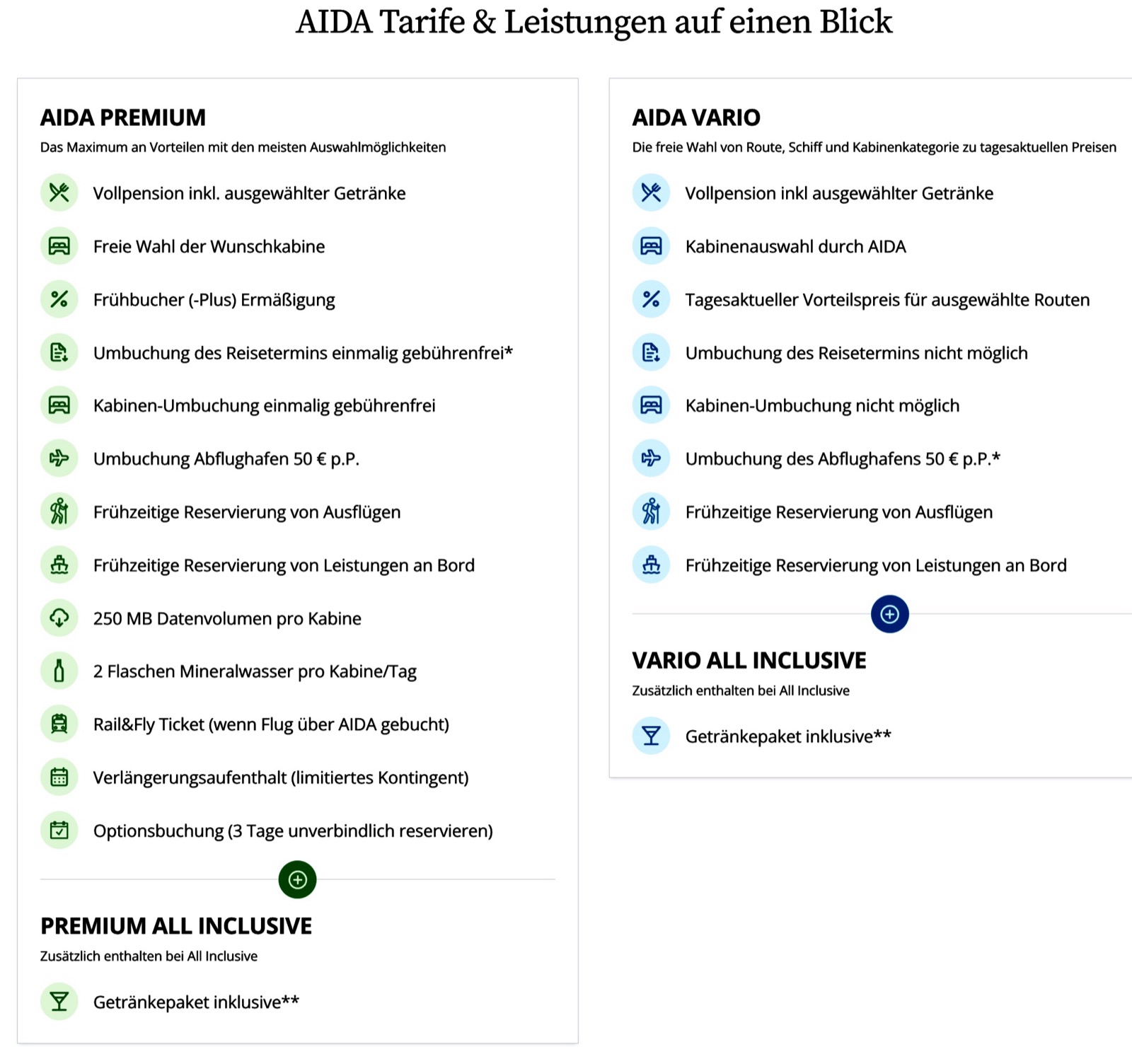 ✅Leistungen | Kabine wird zugeteilt, keine Umbuchung, keine Wunschkabine, Vollpension | Wahl der Kategorie, keine Wunschkabine, AIDA Inklusivleistungen |